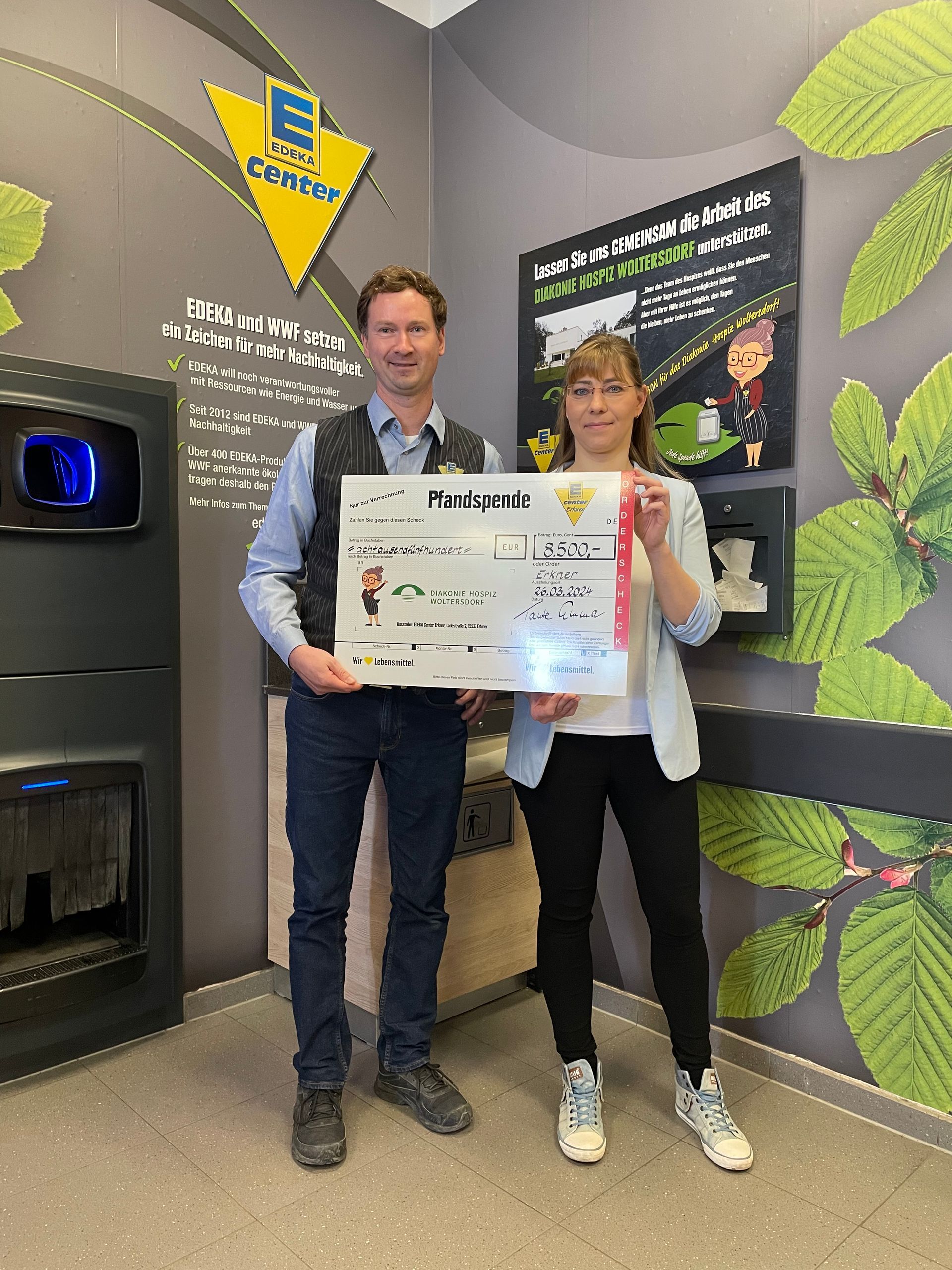 Das Diakonie Hospiz Woltersdorf sorgte im März für Schlagzeilen mit einer erfreulichen Nachricht im Zusammenhang mit EDEKA. Seit drei Jahren ist beim Einkaufsmarkt am Bahnhof Erkner sehr prominent eine Spendenbox aufgestellt, in die Kunden ihre Pfandbons für die Arbeit des Diakonie Hospiz Woltersdorf spenden können. Und das haben sie sehr fleißig getan. Ganze 8.500 Euro sind zusammengekommen. Jeder noch so kleine Betrag hat zu dieser beachtlichen Summe beigetragen.